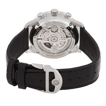 Silver-tone stainless steel case with a black leather strap. Fixed silver-tone stainless steel bezel. Beige dial with rose gold-tone hands and index-Arabic numeral hour markers. Minute scale around the inner rim. Dial Type: Analog. Chronograph - two sub-dials displaying: 60 second and 30 minute. IWC Calibre 69355 Automatic movement, based upon IWC 69370, containing 27 Jewels, composed of 194 parts, bitting at 28800 vph, and has a power reserve of approximately 46 hours. Scratch resistant sapphire crystal. Screw down crown. Transparent see through case back. Round case shape, case size: 41 mm, case thickness: 13 mm. Buckle clasp. Water resistant at 30 meters / 100 feet. Functions: chronograph, hour, minute, second. Portugieser Series. Dress watch style. Watch label: Swiss Made. IWC Portugieser Chronograph Automatic Men's Watch IW371624.