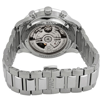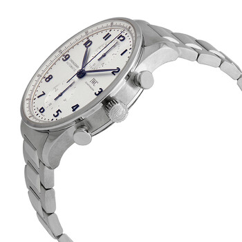 Stainless steel case with a stainless steel bracelet. Fixed stainless steel bezel. Silver dial with blue hands and Arabic numeral hour markers. Arabic numeral minute markers (at 5 minute intervals). Minute markers around the outer rim. Dial Type: Analog. Chronograph - two sub-dials displaying: 60 second and 30 minute. IWC calibre 69355 automatic movement, based upon IWC 69370, containing 27 Jewels, composed of 194 parts, bitting at 28800 vph, and has a power reserve of approximately 46 hours. Scratch resistant sapphire crystal. Screw down crown. Transparent s case back. Round case shape. Case size: 41 mm. Case thickness: 13 mm. Deployment clasp. Water resistant at 30 meters / 100 feet. Functions: chronograph, column wheel, hour, minute, small second. Portugieser Series. Luxury watch style. Watch label: Swiss Made. IWC Portugieser Chronograph Automatic Silver Dial Men's Watch IW371617.