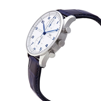 Stainless steel case with a blue (alligator) leather strap. Fixed stainless steel bezel. Silver dial with blue leaf-style hands and Arabic numeral hour markers. Minute markers around the outer rim. Dial Type: Analog. Chronograph - two sub-dials displaying: 60 second and 30 minute. IWC calibre 69355 automatic movement, based upon IWC 69370, containing 27 Jewels, composed of 194 parts, bitting at 28800 vph, and has a power reserve of approximately 46 hours. Scratch resistant sapphire crystal. Pull / push crown. Transparent case back. Round case shape. Case size: 41 mm. Case thickness: 13.1 mm. Band width: 20 mm. Deployment clasp. Water resistant at 30 meters / 100 feet. Functions: chronograph, column wheel, hour, minute, small second. Portugieser Series. Luxury watch style. Watch label: Swiss Made. IWC Portugieser Chronograph Automatic Silver Dial Watch IW3716-05.