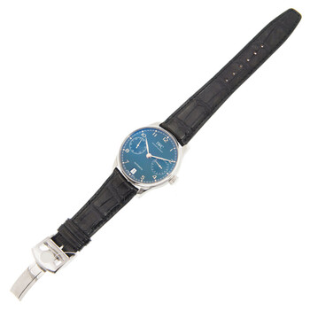 Stainless steel case with a black crocodile leather strap. Fixed stainless steel bezel. Green dial with silver-tone hands and Arabic numeral hour markers. Minute markers around the outer rim. Dial Type: Analog. Date display at the o'clock position. Two - 60 second and power reserve indicator subdials. IWC Calibre 52010 automatic movement with a 168-hour power reserve. Scratch resistant sapphire crystal. Case size: 42.3 mm. Case thickness: 14.5 mm. Round case shape. Silver-tone clasp. Water resistant at 30 meters / 100 feet. Functions: hour, minute, small second, power reserve indicator. Luxury watch style. Watch label: Swiss Made. IWC Portugieser Automatic Men's Watch IW500708.