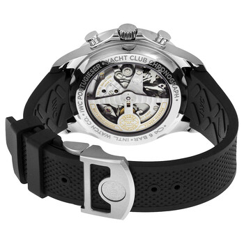 Silver-tone stainless steel case with a black rubber strap. Fixed silver-tone stainless steel bezel. Anthracite dial with luminous silver-tone leaf-style shape hands and Arabic numeral hour markers. Minute markers around the outer rim. Dial Type: Analog. Luminescent hands and markers. Date display at the 3 o'clock position. Chronograph - two sub-dials displaying: 60 second and 2nd time zone. IWC Calibre 89361 Automatic movement, based upon IWC 89360, containing 38 Jewels, and has a power reserve of approximately 68 hours. Scratch resistant sapphire crystal. Screw down crown. Skeleton case back. Round case shape, case size: 43.5 mm, case thickness: 14.5 mm. Deployment clasp. Water resistant at 60 meters / 200 feet. Functions: chronograph, flyback, date, hour, minute, small second. Portugieser Yacht Club Series. Luxury watch style. Watch label: Swiss Made. IWC Portugieser Yacht Club Automatic Anthracite Dial Black Rubber Men's Watch 3905-03.