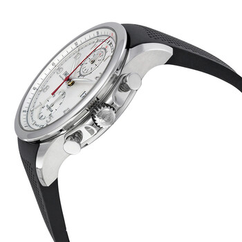 Silver-tone stainless steel case with a black rubber strap. Fixed silver-tone stainless steel bezel. White dial with luminous silver-tone leaf-style shape hands and Arabic numeral hour markers. Minute markers around the outer rim. Dial Type: Analog. Luminescent hands and markers. Date display at the 3 o'clock position. Chronograph - two sub-dials displaying: 60 second and a dual 60 minute / 2nd time zone. IWC Calibre 89361 Automatic movement, based upon IWC 89360, containing 38 Jewels, and has a power reserve of approximately 68 hours. Scratch resistant sapphire crystal. Screw down crown. Skeleton case back. Round case shape, case size: 43.5 mm, case thickness: 14.5 mm. Deployment clasp. Water resistant at 60 meters / 200 feet. Functions: chronograph, flyback, date, hour, minute, small second. Portugieser Yacht Club Series. Luxury watch style. Watch label: Swiss Made. IWC Portugieser Yacht Club Automatic Men's Watch 3905-02.