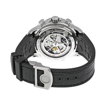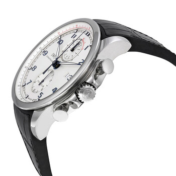 Stainless steel case with a black alligator leather strap. Fixed stainless steel bezel. Silver dial with blue luminous hands and Arabic numeral hour markers. Minute markers around the outer rim. Dial Type: Analog. Luminescent hands and markers. Date display at the 3 o'clock position. Chronograph - two sub-dials displaying: 60 second and a dual 60 minute / 2nd time zone. Automatic movement. Scratch resistant sapphire crystal. Screw down crown. Skeleton case back. Case diameter: 45.4 mm. Case thickness: 14.5 mm. Round case shape. Deployment clasp. Water resistant at 60 meters / 200 feet. Functions: chronograph, date, hour, minute, second. Luxury watch style. Watch label: Swiss Made. IWC Portugieser Yacht Club Silver DIal Black Alligator Leather Men's Watch 3902-16.