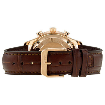 18kt rose gold case with a brown (alligator) leather strap. Fixed 18kt rose gold bezel. Silver dial with rose gold-tone leaf-style hands and Arabic numeral hour markers. Minute markers around the outer rim. Dial Type: Analog. Chronograph - two sub-dials displaying: 60 second and 30 minute. IWC calibre 79350 automatic movement, based upon ETA 7750, containing 31 Jewels, bitting at 28800 vph, and has a power reserve of approximately 44 hours. Scratch resistant sapphire crystal. Pull / push crown. Solid case back. Round case shape. Case size: 40.9 mm. Case thickness: 12.3 mm. Band width: 22 mm. Tang clasp. Water resistant at 30 meters / 100 feet. Functions: chronograph, hour, minute, second. Portuguese Series. Luxury watch style. Watch label: Swiss Made. IWC Portuguese 18kt Rose Gold Automatic Chronograph Silver Dial Men's Watch IW371480.