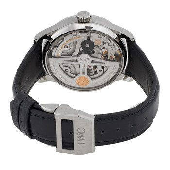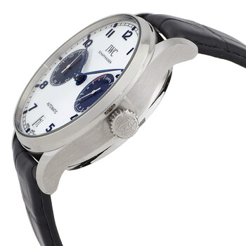 Silver-tone stainless steel case with a blue alligator band. Fixed silver-tone stainless steel bezel. White dial with blue hands and Arabic numeral hour markers. Minute markers around the outer rim. Dial Type: Analog. Date display at the 6 o'clock position. Two sub-dials displaying: 60 second and power reserve indicator. IWC Calibre 52010 Automatic movement, containing 31 Jewels, composed of 257 parts, bitting at 28800 vph, and has a power reserve of approximately 168 hours. Scratch resistant sapphire crystal. Transparent see through case back. Round case shape, case size: 42 mm. Water resistant at 30 meters / 100 feet. Functions: date, hour, minute, small second, power reserve indicator. Additional Info: original box, international warranty card, manual (complete accessories). Portuguese Series. Luxury watch style. Watch label: Swiss Made. IWC Portuguese Automatic White Dial Men's Watch IW500715.