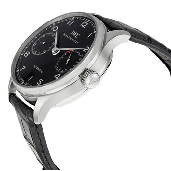 Stainless steel case with a black (alligator) leather strap. Fixed stainless steel bezel. Black dial with silver-tone leaf-style hands and Arabic numeral hour markers. Minute markers around the outer dial. Dial Type: Analog. Luminescent hands and dial markers. Date display at the 6 o'clock position. Two displays: 60 second and 7 day power reserve indicator. IWC calibre 51010 automatic movement, based upon IWC 50010, containing 44 Jewels, bitting at 21600 vph, and has a power reserve of approximately 168 hours. Scratch resistant sapphire crystal. Pull / push crown. Transparent case back. Round case shape. Case size: 42.3 mm. Case thickness: 13.9 mm. Band width: 20 mm. Deployment clasp. Water resistant at 30 meters / 100 feet. Functions: hours, minutes, small seconds (with stop function) at 9 o'clock, power reserve at 3 o'clock, calendar. Portuguese Automatic Series. Sport watch style. Watch label: Swiss Made. Item Variations: 5001-09, 5001/09, 500109, IWC-5001-09 IW500109, 5001-09, 5001/09, 500109, IWC-50. IWC Portuguese Automatic Black Dial Black Leather Men's Watch IW500109.