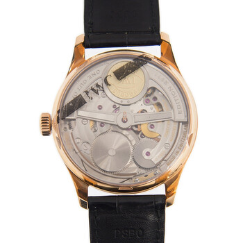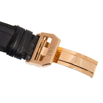 18kt rose gold case with a alligator leather strap. Fixed 18kt rose gold bezel. Black dial with rose gold-tone leaf-style shape hands and Arabic numeral hour markers. Minute markers around the outer rim. Dial Type: Analog. Date display at the 6 o'clock position. Two sub-dials displaying: small second and power reserve indicator. IWC Calibre 51011 automatic movement with a 168-hour / 7-day power reserve. Scratch resistant sapphire crystal. Pull / push crown. Skeleton case back. Round case shape, case size: 42.3 mm, case thickness: 14 mm. Deployment with push button release clasp. Water resistant at 30 meters / 100 feet. Functions: date, hour, minute, second, power reserve indicator. Additional Info: limited edition of 888 pieces. Portuguese Series. Luxury watch style. Watch label: Swiss Made. IWC Portuguese Automatic Black Dial Men's Watch IW500121.
