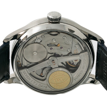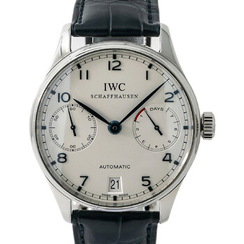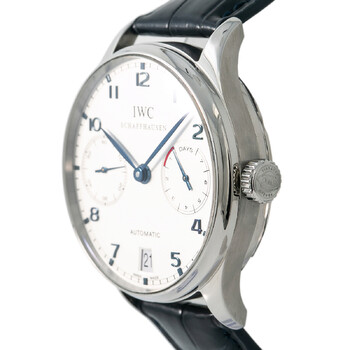 Stainless steel case with a blue croco-embossed leather strap. Fixed stainless steel bezel. Silver dial with blue hands and Arabic numeral hour markers. Minute markers on the outer rim. Automatic date at the 6 o'clock position. Two sub-dials displaying: seconds and 7 day power reserve. Automatic movement. Scratch resistant sapphire crystal. Screw down crown. Screw-down sapphire crystal exhibition case back. Case diameter: 42.3mm. Case thickness: 13.9 mm. Deployment clasp. Water resistant at 30 meters / 100 feet. Functions: hours, minutes, small seconds (with stop function) at 9 o'clock, power reserve at 3 o'clock, calendar. IWC Portuguese Automatic Steel Blue Men's Watch IW500107.