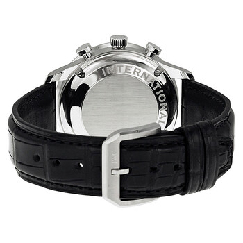 Silver-tone stainless steel case with a black leather strap. Fixed silver-tone stainless steel bezel. Black dial with silver-tone leaf-style shape hands and Arabic numeral hour markers, minute markers on the outer rim hour markers. Minute markers around the outer rim. Dial Type: Analog. Luminescent hands and dial markers. Chronograph - two sub-dials displaying: 60 second and 30 minute. IWC Calibre 79240 Automatic movement, based upon ETA 7750, containing 31 Jewels, bitting at 28800 vph, and has a power reserve of approximately 44 hours. Scratch resistant sapphire crystal. Stainless steel screw-down crown. Solid case back. Round case shape, case size: 40.9 mm, case thickness: 12.3 mm. Tang clasp. Water resistant at 30 meters / 100 feet. Functions: hours, minutes, seconds, chronograph. Portuguese Chrono-automatic Series. Dress watch style. Watch label: Swiss Made. Item Variations: IW371438, 3714-38, 3714/38, 371438, IWC-3714-38. IWC Portuguese Chrono Automatic Steel Men's Watch IW371438.