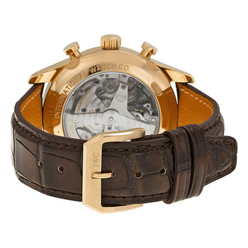 18 kt rose gold case with a brown alligator leather strap. Fixed 18 kt rose gold bezel. Silver dial with rose gold-tone hands and Arabic numeral hour markers. Minute markers around the outer rim. Dial Type: Analog. Date display at the 3 o'clock position. Chronograph - two sub-dials displaying: 60 second and a dual 60 minute/12 hour. Automatic movement with 68 hour power reserve. Calibre 89361 engine. Scratch resistant sapphire crystal. Skeleton case back. Case diameter: 42 mm. Case thickness: 14.5 mm. Round case shape. Tang clasp. Water resistant at 30 meters / 100 feet. Functions: chronograph, date, hour, minute, second. Luxury watch style. Watch label: Swiss Made. IWC Portuguese Chronograph Classic Automatic Rose Gold Men's Watch IW390402.