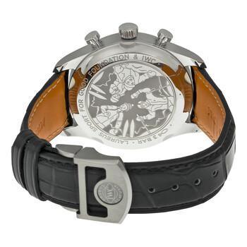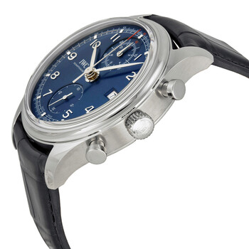 Stainless steel case with a black alligator leather strap. Fixed stainless steel bezel. Blue dial with silver-tone hands and Arabic numeral hour markers. Minute markers around the outer rim. Dial Type: Analog. Luminescent hands and markers. Date display at the 3 o'clock position. Chronograph - two sub-dials displaying: 60 second and and dual 12 hour / 60 minute. Automatic movement with a 68 hour power reserve. Scratch resistant sapphire crystal. Screw down crown. Solid case back. Case diameter: 42 mm. Case thickness: 14.5 mm. Round case shape. Band width: 20 mm. Band length: 8 inches. Deployment clasp. Water resistant at 30 meters / 100 feet. Luxury watch style. Watch label: Swiss Made. IWC Portuguese Chronograph Classic Edition Laureus Blue Dial Black Leather Men's Watch IW3904-06.