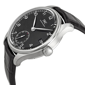 Silver-tone stainless steel case with a black leather strap. Fixed silver-tone stainless steel bezel. Black dial with silver-toned leaf-style hands and Arabic numeral hour markers. Minute markers around the outer rim. Dial Type: Analog. Date display at the 3 o'clock position. One subdial displaying: small second. IWC Calibre 59215 Hand Wind movement, containing 30 Jewels, bitting at 28800 vph, and has a power reserve of approximately 192 hours. Scratch resistant sapphire crystal. Pull / push crown. Skeleton case back. Round case shape, case size: 43 mm, case thickness: 12 mm. Band width: 20 mm. Tang clasp. Water resistant at 30 meters / 100 feet. Functions: date, hour, minute, second. Portuguese Series. Luxury watch style. Watch label: Swiss Made. IWC Portuguese Hand Wound Eight Days Black Leather Men's Watch IW510202.