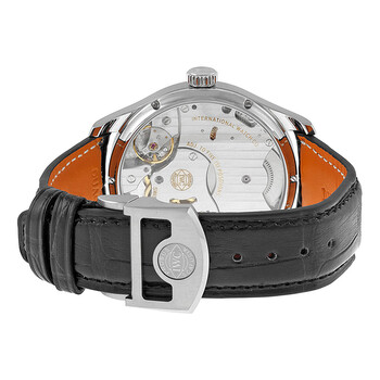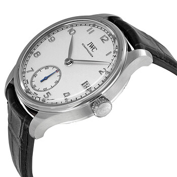 Stainless steel case with a black alligator leather strap. Fixed stainless steel bezel. Silver dial with silver-tone hands and Arabic numeral hour markers. Minute markers around the outer rim. Dial Type: Analog. Date display at the 3 o'clock position. Small seconds sub-dial at the 6 o'clock position. Manual wind movement with eight day power reserve. Scratch resistant sapphire crystal. Pull / push crown. Skeleton case back. Case diameter: 43 mm. Case thickness: 12 mm. Round case shape. Deployment clasp with push button. Water resistant at 30 meters / 100 feet. Functions: date, hour, minute, second. Luxury watch style. Watch label: Swiss Made. IWC Portuguese Hand Wound Eight Days Stainless Steel Men's Watch IW510203.
