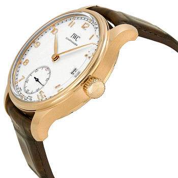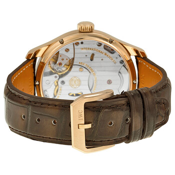 18 kt rose gold case with a brown alligator leather strap. Fixed 18 kt rose gold bezel. Silver dial with rose gold-tone hands and Arabic numeral hour markers. Minute markers around the outer rim. Dial Type: Analog. Date display at the 3 o'clock position. Small seconds sub-dial at the 6 o'clock position. Manual wind movement with eight day power reserve. Scratch resistant sapphire crystal. Pull / push crown. Skeleton case back. Case diameter: 43 mm. Case thickness: 12 mm. Round case shape. Tang clasp. Water resistant at 30 meters / 100 feet. Functions: date, hour, minute, second. Luxury watch style. Watch label: Swiss Made. IWC Portuguese Manual Wind Eight Days Rose Gold Men's Watch IW510204.