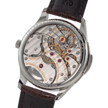 18kt white gold case with a brown leather strap. Fixed bezel. Grey dial with silver-tone hands and Arabic numeral hour markers, minute markers on the outer rim hour markers. Dial Type: Analog. 60-second subdials. IWC Calibre 95290 hand wind movement with a 43-hour power reserve. Scratch resistant sapphire crystal. 18k white gold, fluted crown. See through exhibition crystal case back. Case size: 43 mm. Case thickness: 12.3 mm. Round case shape. Tang clasp. Water resistant at 30 meters / 100 feet. Functions: hours, minutes, small seconds hand with stop function, minute repeater. Additional Info: limited edition of 250 watches; small seconds subdial; 43-hour power reserve when fully wound; minute repeater; breguet spring. Dress watch style. Watch label: Swiss Made. IWC Portuguese Minute Repeater Limited Edition Men's Watch IW524205.