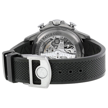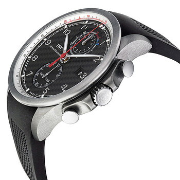 Grey titanium case with a black rubber strap. Fixed grey titanium bezel. Black carbon fiber dial with luminous silver-tone leaf-style shape hands and Arabic numeral hour markers. Arabic numeral minute markers (at 5 minute intervals). Minute markers around the outer rim. Dial Type: Analog. Luminescent hands and markers. Date display at the 3 o'clock position. Chronograph - two sub-dials displaying: 60 second and 12 hour. IWC calibre 89360 automatic movement, containing 40 Jewels, bitting at 28800 vph, and has a power reserve of approximately 68 hours. Scratch resistant sapphire crystal. Screw down crown. Skeleton case back. Round case shape. Case size: 45.4 mm. Case thickness: 14.5 mm. Tang clasp. Water resistant at 60 meters / 200 feet. Functions: chronograph, date, hour, minute, second. Portuguese Yacht Club Series. Luxury watch style. Watch label: Swiss Made. IWC Portuguese Yacht Club Automatic Chronograph Men's Watch 3902-12.