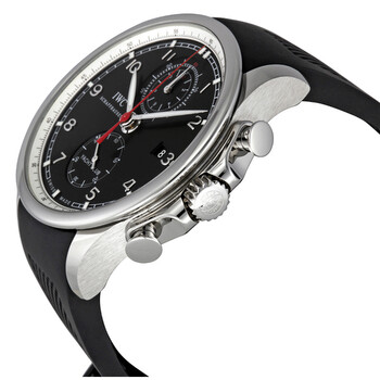 Stainless steel case with a black rubber strap. Fixed stainless steel bezel. Black dial with luminous steel hands and Arabic numeral hour markers. Minute markers arond the outer rim. Dial Type: Analog. Luminescent hands. Date display at the 3 o'clock position. Chronograph - two sub-dials displaying: 60 minutes and 12 hours. Self winding automatic movement with a 68-hour power reserve. Scratch resistant sapphire crystal. Screw down crown. Transparent case back. Case diameter: 45.4 mm. Case thickness: 14.5 mm. Deployment clasp. Water resistant at 60 meters (200 feet). Functions: hours, minutes, seconds, chronograph, date, stopwatch. Additional Info: 68-hour power reserve when fully wound. Luxury watch style. IWC Portuguese Yacht Club Chronograph Men's Watch IW390210.