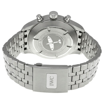 Stainless steel case with a stainless steel bracelet. Fixed stainless steel bezel. Ardoise dial with luminous silver-tone hands and Arabic numeral hour markers. Minute markers around the outer rim. Dial Type: Analog. Luminescent hands and markers. Date display at the 3 o'clock position. Chronograph - two sub-dials displaying: 60 second and 60 minute. IWC calibre 89365 automatic movement with a 68-hour power reserve. Scratch resistant sapphire crystal. Pull / push crown. Solid case back. Round case shape. Case size: 43 mm. Case thickness: 15.5 mm. Band width: 20 mm. Band length: 9 inches. Deployment clasp. Water resistant at 60 meters / 200 feet. Functions: chronograph, flyback, date, hour, minute, small second. Luxury watch style. Watch label: Swiss Made. IWC Spitfire Chronograph Ardoise Dial Men's Watch IW387804.