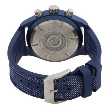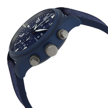 Blue ceramic case with a blue rubber with textile inlay strap. Fixed blue ceramic bezel. Blue dial with luminous black hands and Arabic numeral hour markers. Minute markers around the outer rim. Dial Type: Analog. Luminescent hands and markers. Day and date display at the 3 o'clock position. Chronograph - three sub-dials displaying: 60 second, 30 minute and 12 hour. 69380 automatic movement with a 46-hour power reserve. Scratch resistant sapphire crystal. Screw down crown. Solid case back. Round case shape, case size: 41.9 mm. Fold over clasp with a safety release. Water resistant at 100 meters / 330 feet. Functions: chronograph, date, hour, minute, second. Sport watch style. Watch label: Swiss Made. IWC Chronograph Automatic Blue Dial Men's Watch IW389404.