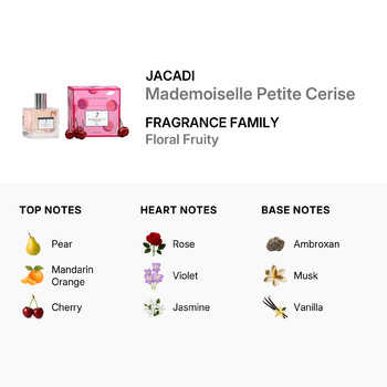 Mademoiselle Petite Cerise opens with a burst of juicy pear, sweet cherry, and zesty mandarin orange. These top notes create an inviting and playful start that instantly brightens your mood. As the fragrance settles, a graceful heart of rose, violet, and jasmine blooms, adding a soft, romantic touch that feels light and lovely on the skin.