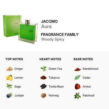 Jacomo Aura opens with a fresh and energetic burst of ginger, lemon, sage, and juniper. These top notes deliver a crisp and invigorating experience, perfect for making a strong first impression. As the scent settles, warm heart notes of green tea, tobacco, tonka bean, nutmeg, and cinnamon emerge, adding depth and a touch of unexpected sophistication.