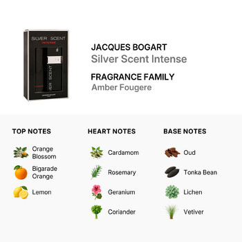 The composition of Silver Scent Intense opens with a refreshing and invigorating blend of orange blossom, Bigarade orange, and lemon. These top notes give the fragrance a crisp and citrusy start, leading the way for a rich and spicy heart. The heart notes feature a sophisticated mix of cardamom, rosemary, geranium, coriander, nutmeg, and lavender, creating a harmonious balance between warmth and freshness. The journey concludes with a deep and woody base of oud, tonka bean, lichen, vetiver, and teak, ensuring a lasting impression that is both intense and unmistakably masculine.