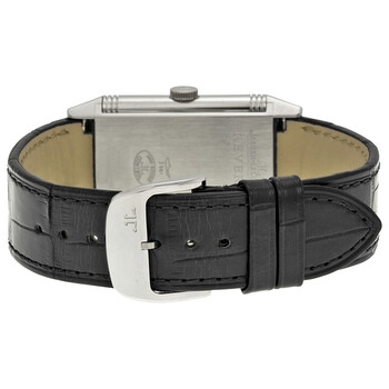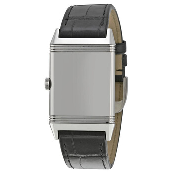 Silver-tone stainless steel case with a black leather strap. Fixed silver-tone stainless steel bezel. Black brillant opaline dial with silver-tone sword-shaped hands and index hour markers. Minute markers around the outer rim. Dial Type: Analog. Jaeger LeCoultre Calibre JLC 822 Hand Wind movement, containing 21 Jewels, composed of 134 parts, bitting at 21600 vph, and has a power reserve of approximately 45 hours. Scratch resistant sapphire crystal. Pull / push crown. Solid case back. Rectangle case shape, case size: 46 mm x 27.5 mm, case thickness: 7.2 mm. Band width: 20 mm. Tang clasp. Water resistant at 30 meters / 100 feet. Functions: hour, minute, second. Reverso Grande Ultra Thin Series. Casual watch style. Watch label: Swiss Made. Item Variations: Q2788570, 2788570, 278.85.70, Q278.85.70. Jaeger Le Coultre Reverso Grande Ultra Thin Men's Watch Q2788570.