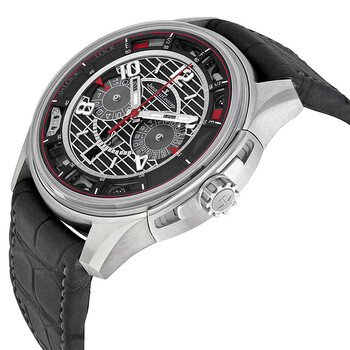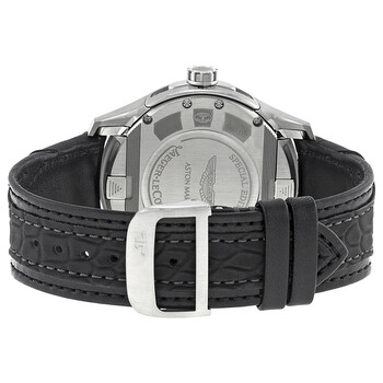Grey titanium case with a black calfskin leather strap. Fixed grey titanium bezel. Black openworked skeleton dial with silver-tone hands and Arabic numeral and index hour markers. Minute markers around an inner ring. Dial Type: Analog. Luminescent hands and markers. Date display at the 6 o'clock position. Chronograph - two sub-dials displaying: 12 hour and 30 minute. Jaeger LeCoultre Calibre JLC 756 Automatic movement, containing 39 Jewels, bitting at 28800 vph, and has a power reserve of approximately 65 hours. Scratch resistant sapphire crystal. Pull / push crown. Solid case back. Round case shape, case size: 44 mm, case thickness: 15.65 mm. Band width: 22 mm. Fold over clasp. Water resistant at 50 meters / 165 feet. Functions: chronograph, hour, minute, second. Additional Info: aston martin special edition. Amvox7 Chronograph Series. Sport watch style. Watch label: Swiss Made. Item Variations: Q194T470, 194T470, 194.T4.70, Q194.T4.70. Jaeger LeCoultre AMVOX7 Chronograph Black Dial Calfskin Leather Automatic Men's Watch Q194T470.