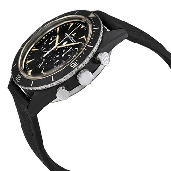 Black cermet & titanium case with a black textile strap. Uni-directional rotating coin edge titanium bezel with a black cermet count-up elapsed time top ring. Black dial with gold-tone luminous syringe-shaped hands and index hour markers. Minute markers around the outer rim. Dial Type: Analog. Luminescent hands and markers. Chronograph - three sub-dials displaying: 60 second, 30 minute and 12 hour. Jaeger LeCoultre Calibre JLC 758 Automatic movement, containing 37 Jewels, composed of 340 parts, bitting at 28800 vph, and has a power reserve of approximately 65 hours. Scratch resistant sapphire crystal. Screw down crown. Solid case back. Round case shape, case size: 44 mm, case thickness: 14.5 mm. Band width: 20 mm. Tang clasp. Water resistant at 100 meters / 330 feet. Functions: chronograph, hour, minute, second. Additional Info: cermet is a high-tech material consisting of aluminum reinforced with particles of ceramic and then covered with a protective coating of ceramic, has. Deep Sea Chrono Series. Luxury watch style. Watch label: Swiss Made. Item Variations: Q208A57J, 208A57J, 208.A5.7J, Q208.A5.7J. Jaeger LeCoultre Deep Sea Chronograph Vintage Cermet Automatic Men's Watch Q208A57J.
