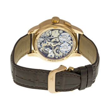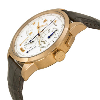 18kt rose gold case with a dark matte brown alligator leather strap. Fixed 18kt rose gold bezel. Silver dial with rose gold hands and Arabic numeral hour markers. Minute markers around the outer rim. Dial Type: Analog. Jaeger LeCoultre Calibre JLC 380 Hand Wind movement, containing 48 Jewels, composed of 445 parts, bitting at 21600 vph, and has a power reserve of approximately 50 hours. Scratch resistant sapphire crystal. Pull / push crown. Transparent case back. Round case shape, case size: 42 mm, case thickness: 13.5 mm. Band width: 21 mm, band length: 8 inches. Double fold over clasp. Water resistant at 50 meters / 165 feet. Functions: central hours, minutes and seconds, power reserve indicator, chronograph: concentric hours and minutes, minute-unit indicator, seconds, jumping seconds, chronograph power reserve. Duometre And Chronograph Series. Luxury watch style. Watch label: Swiss Made. Item Variations: Q6012420, 6012420, 601.24.20, Q601.24.20. Jaeger LeCoultre Duometre Silver Dial Men's Watch Q6012420.
