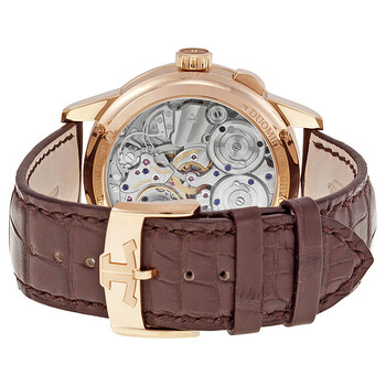 18kt rose gold case with a brown alligator leather strap. Fixed 18kt rose gold bezel. Silver with skeletal display dial with rose gold-tone hands. Minute markers around the outer rim. Dial Type: Analog. Chronograph - three sub-dials displaying: 60 second/12 hour, 60 minute and12 hour. Jaeger LeCoultre Calibre JLC 380A Hand Wind movement, containing 40 Jewels, composed of 445 parts, bitting at 21600 vph, and has a power reserve of approximately 50 hours. Scratch resistant sapphire crystal. Transparent case back. Round case shape, case size: 42 mm, case thickness: 14.3 mm. Band width: 21 mm, band length: 8 inches. Tang clasp. Water resistant at 50 meters / 165 feet. Functions: chronograph, second time zone, hour, minute, second. Additional Info: jaeger-lecoultre in-house made caliber 380a manually wound movement that is made up of 445 pieces. Duometre A Chronographe Series. Luxury watch style. Watch label: Swiss Made. Item Variations: Q6012521, 6012521, 601.25.21, Q601.25.21. Jaeger LeCoultre Duometre Silver Dial Men's Watch Q6012521.