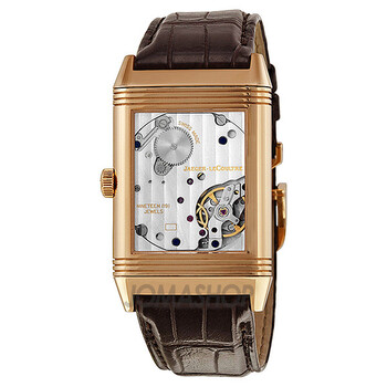 18kt rose gold case with a brown leather strap. Fixed 18kt rose gold bezel. Silver dial with blued steel sword-shaped hands and black Arabic numeral hour markers. Minute markers around an inner ring. Dial Type: Analog. One subdial displaying: small second. Jaeger LeCoultre Calibre JLC 976 Hand Wind movement, containing 19 Jewels, bitting at 28800 vph, and has a power reserve of approximately 48 hours. Scratch resistant sapphire crystal. Pull / push crown. Solid case back. Rectangle case shape, case size: 48.5 mm x 30 mm. Deployment with push button release clasp. Water resistant at 30 meters / 100 feet. Functions: date, hour, minute, second. Grande Reverso 976 Series. Luxury watch style. Watch label: Swiss Made. Item Variations: Q3732420, 3732420, 373.24.20, Q373.24.20. Jaeger LeCoultre Grande Reverso 976 Leather Men's Watch Q3732420.