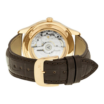 18kt rose gold case with a brown (alligator) leather strap. Fixed 18kt rose gold bezel. Silver dial with rose gold-tone dauphine-style hands and index hour markers. Arabic numerals appear at the 3, 9 and 12 o'clock positions. Date scale around the outer rim. Dial Type: Analog. Month and day of the week display below the 12 o'clock position. Small seconds / moonphase sub-dial at the 6 o'clock position. Jaeger LeCoultre calibre JLC 866 automatic movement, containing 32 Jewels, composed of 305 parts, bitting at 28800 vph, and has a power reserve of approximately 43 hours. Scratch resistant sapphire crystal. Pull / push crown. Transparent case back. Round case shape. Case size: 39 mm. Case thickness: 10.6 mm. Band width: 20 mm. Tang clasp. Water resistant at 50 meters / 165 feet. Functions: full calendar, moon phase, month, date, day, hour, minute, small second. Master Calendar Series. Luxury watch style. Watch label: Swiss Made. Item Variations: Q1552520, 1552520, 155.25.20, Q155.25.20. Jaeger LeCoultre Master Calendar Automatic Men's Watch Q1552520.