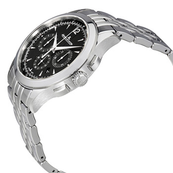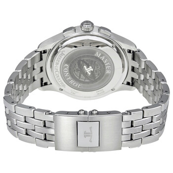 Silver-tone stainless steel case with a silver-tone stainless steel bracelet. Fixed silver-tone stainless steel bezel. Black dial with silver-tone dauphine-style shape hands and index hour markers. Arabic numeral appears at the 12 o'clock position. minute markers. tachymeter markings around the outer rim. Dial Type: Analog. Date display between the 4 and 5 o'clock positions. Chronograph - three sub-dials displaying: 60 second, 30 minute and 12 hour. Jaeger LeCoultre Calibre JLC 751A/1 Automatic movement, containing 41 Jewels, composed of 277 parts, bitting at 28800 vph, and has a power reserve of approximately 65 hours. Scratch resistant sapphire crystal. Pull / push crown. Solid case back. Round case shape, case size: 40 mm, case thickness: 12.6 mm. Deployment clasp. Water resistant at 50 meters / 165 feet. Functions: chronograph, tachymeter, date, hour, minute, second. Master Chronograph Series. Luxury watch style. Watch label: Swiss Made. Jaeger LeCoultre Master Chronograph Automatic Men's Watch Q1538171.