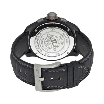 Black ceramic case with a black alligator leather strap. Fixed black ceramic bezel. Black dial with black hands and index hour markers. Arabic numerals mark the 6 and 12 o'clock positions. minute markers around the outer rim. Dial Type: Analog. Luminescent hands and markers. Date display between 4 and 5 o'clock position. Chronograph - three sub-dials displaying: 60 second, 30 minute and 12 hour. Jaeger LeCoultre Calibre JLC 751F Automatic movement, containing 39 Jewels, composed of 277 parts, bitting at 28800 vph, and has a power reserve of approximately 65 hours. Scratch resistant anti-reflective sapphire crystal. Screw down crown. Solid stainless steel case back. Round case shape, case size: 44 mm, case thickness: 13.27 mm. Deployment with push button release clasp. Water resistant at 50 meters / 165 feet. Functions: chronograph, hour, minute, second. Master Compressor Series. Luxury watch style. Watch label: Swiss Made. Item Variations: Q204C470, 204C470, 204.C4.70, Q204.C4.70. Jaeger Lecoultre Master Compresser Black Dial Alligator Men's Watch Q204C470.