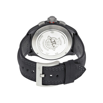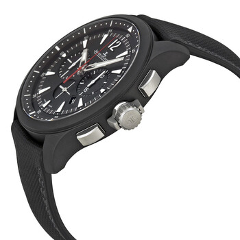 Black ceramic case with a high tech material band. Fixed black ceramic bezel. Black dial with luminous hands and index hour markers. Arabic numeral marks the 12 o'clock position. minute markers around the outer rim. Dial Type: Analog. Luminescent hands and markers. Date display between 4 and 5 o'clock position. Chronograph - three sub-dials displaying: 60 second, 30 minute and 12 hour. Jaeger LeCoultre Calibre JLC 757 Automatic movement, containing 45 Jewels, bitting at 28800 vph, and has a power reserve of approximately 65 hours. Scratch resistant sapphire crystal. Screw down crown. Solid case back. Round case shape, case size: 46 mm, case thickness: 14.3 mm. Tang clasp. Water resistant at 100 meters / 330 feet. Functions: chronograph, date, hour, minute, second. Additional Info: limited edition of 500 pieces. Master Compressor Series. Luxury watch style. Watch label: Swiss Made. Item Variations: Q205C570, 205C570, 205.C5.70, Q205.C5.70. Jaeger Lecoultre Master Compressor Chronograph Black Dial Men's Watch Q205C570.