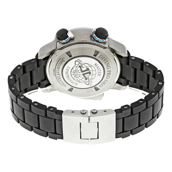 Grey titanium case with a black rubber strap. Uni-directional rotating grey titanium bezel. Black dial with luminous hands and index hour markers. Arabic numerals mark the 6 and 12 o'clock positions. minute markers. mechanical depth gauge around the outer rim. Dial Type: Analog. Luminescent hands and markers. Date display at the 3 o'clock position. Two sub-dials displaying: 24 hour (GMT) and power reserve indicator. Jaeger LeCoultre Calibre JLC 979 Automatic movement, containing 23 Jewels, composed of 268 parts, bitting at 28800 vph, and has a power reserve of approximately 48 hours. Scratch resistant sapphire crystal. Black rubber-clad crown. Solid case back. Round case shape, case size: 46.3 mm, case thickness: 20 mm. Deployment clasp. Water resistant at 300 meters / 1000 feet. Functions: mechanical depth gauge, GMT, second time zone, hour, minute, second. Master Compressor Diving Pro Geographic Series. Luxury watch style. Watch label: Swiss Made. Item Variations: Q185T770, 185T770, 185.T7.70, Q185.T7.70. Jaeger LeCoultre Master Compressor Diving Pro Geographic Black Dial Men's Watch Q185T770.