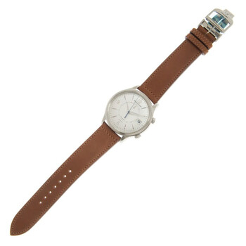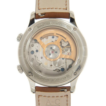 Silver-tone stainless steel case with a brown leather strap. Fixed silver-tone stainless steel bezel. Silver-tone dial with silver-tone hands and index hour markers. Minute markers around the outer rim. Dial Type: Analog. Date display at the 3 o'clock position. Jaeger LeCoultre Calibre 956AA automatic movement. Scratch resistant sapphire crystal. Screw down crown. Transparent see through case back. Round case shape, case size: 40 mm. Deployment with push button release clasp. Water resistant at 50 meters / 165 feet. Functions: date, hour, minute, second. Master Control Series. Luxury watch style. Watch label: Swiss Made. Jaeger LeCoultre Master Control Automatic Silver Dial Men's Watch Q4118420.