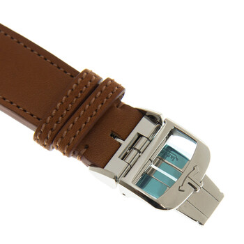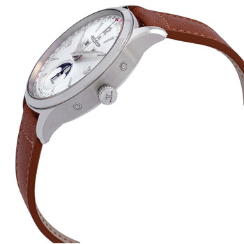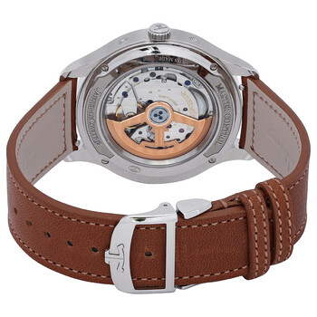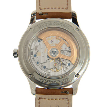 Silver-tone stainless steel case with a brown leather strap. Fixed silver-tone stainless steel bezel. Silver-tone dial with silver-tone hands and index hour markers. Minute markers around the outer rim. Dial Type: Analog. Jaeger LeCoultre Calibre 866AA automatic movement. Scratch resistant sapphire crystal. Transparent see through case back. Round case shape, case size: 40 mm. Deployment with push button release clasp. Water resistant at 50 meters / 165 feet. Functions: month, date, day, hour, minute, second. Master Control Series. Luxury watch style. Watch label: Swiss Made. Jaeger LeCoultre Master Control Automatic Silver Dial Men's Watch Q4148420.