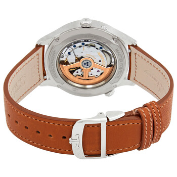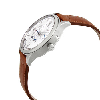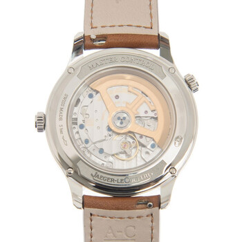 Stainless steel case with a brown leather strap. Fixed stainless steel bezel. Silver dial with luminous silver-tone hands and index hour markers. Arabic numerals appear at the 3, 9 and 12 o'clock positions. Minute markers around the outer rim. Dial Type: Analog. Luminescent hands and markers. World time cities display. Three displays showing: 12 hours, date and power reserve. Jaeger LeCoultre Calibre 939AA automatic movement. Scratch resistant sapphire crystal. Transparent case back. Round case shape. Case size: 40 mm. Case thickness: 10.96 mm. Fold over clasp with a push button release. Water resistant at 50 meters / 165 feet. Functions: chronograph, date, hour, minute, second. Additional Info: original box, manual (complete accessories). Master Control Series. Luxury watch style. Watch label: Swiss Made. Jaeger LeCoultre Master Control Chronograph Automatic Silver Dial Men's Watch Q4128420.