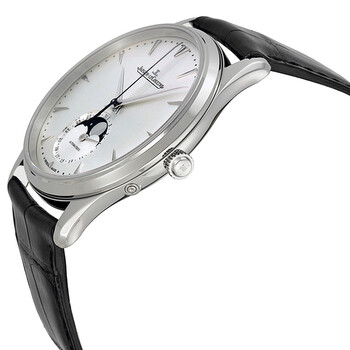 Silver-tone stainless steel case with a black leather strap. Fixed silver-tone stainless steel bezel. Silver dial with silver-tone dauphine-style shape hands and index hour markers. Minute markers around the outer rim. Dial Type: Analog. Date display at the 6 o'clock position. One subdial displaying: date/moonphase. Jaeger LeCoultre Calibre JLC 925 Automatic movement, containing 30 Jewels, composed of 246 parts, bitting at 28800 vph, and has a power reserve of approximately 43 hours. Scratch resistant sapphire crystal. Pull / push crown. Transparent see through case back. Round case shape, case size: 39 mm, case thickness: 9.9 mm. Band width: 21.6 mm. Fold over with safety release clasp. Water resistant at 50 meters / 165 feet. Functions: moonphase, date, hour, minute, second. Master Ultra Thin Moonphase Series. Luxury watch style. Watch label: Swiss Made. Item Variations: Q1368420, 1368420, 136.84.20, Q136.84.20. Jaeger LeCoultre Master Silver Dial Leather Men's Watch Q1368420.