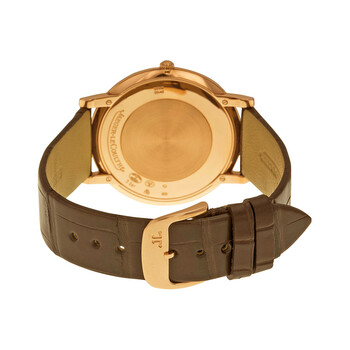 18kt rose gold case with a brown (alligator) leather strap. Fixed 18kt pink gold bezel. White dial with pink gold dauphine-style hands and index hour markers. Minute markers around the outer rim. Dial Type: Analog. Jaeger LeCoultre calibre JLC 849 hand wind movement, containing 19 Jewels, composed of 123 parts, bitting at 21600 vph, and has a power reserve of approximately 35 hours. Scratch resistant sapphire crystal. Pull / push crown. Solid case back. Round case shape. Case size: 39 mm. Case thickness: 4.1 mm. Band width: 20 mm. Band length: 8 inches. Tang clasp. Water resistant at 30 meters / 100 feet. Functions: hour, minute. Master Ultra Thin Series. Luxury watch style. Watch label: Swiss Made. Item Variations: Q1292520, 1292520, 129.25.20, Q129.25.20. Jaeger LeCoultre Master Ultra Thin 1907 Rose Gold Manual Men's Watch Q1292520.