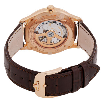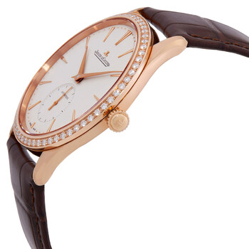 Rose gold-tone 18kt rose gold case with a brown leather strap. Fixed rose gold-tone bezel with diamond set 18kt rose gold. Eggshell beige dial with rose gold-tone hands and index hour markers. Minute markers around the outer rim. Dial Type: Analog. One subdial displaying: small second. Jaeger LeCoultre Calibre JLC 896 Automatic movement, containing 34 Jewels, composed of 242 parts, bitting at 28800 vph, and has a power reserve of approximately 43 hours. Scratch resistant sapphire crystal. Transparent see through case back. Round case shape, case size: 39 mm. Buckle clasp. Water resistant at 50 meters / 165 feet. Functions: hour, minute, small second. Additional Info: 60, diamond, ~0.85 cts. Master Ultra Thin Series. Dress watch style. Watch label: Swiss Made. Jaeger LeCoultre Master Ultra Thin Automatic Diamond Unisex Watch Q1212501.