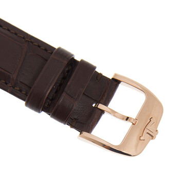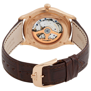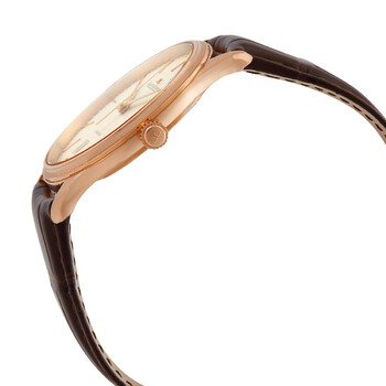 18kt rose gold case with a brown leather strap. Fixed 18kt rose gold bezel. Eggshell beige dial with index hour markers. Dial Type: Analog. Jaeger LeCoultre Calibre 899A/1 Automatic movement, based upon Jaeger LeCoultre 899, containing 32 Jewels, composed of 219 parts, bitting at 28800 vph, and has a power reserve of approximately 38 hours. Scratch resistant sapphire crystal. Transparent see through case back. Round case shape, case size: 39 mm, case thickness: 7.8 mm. Band width: 21 mm. Tang clasp. Water resistant at 50 meters / 165 feet. Functions: date, hour, minute, second. Master Series. Luxury watch style. Watch label: Swiss Made. Jaeger LeCoultre Master Ultra Thin Automatic Men's Watch Q1232510.