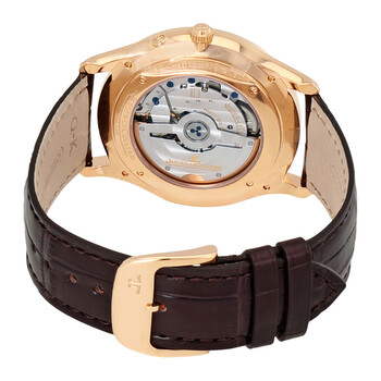 18kt rose gold case with a brown alligator leather strap. Fixed 18kt rose gold bezel with 80 diamond set (0.57 ct). Beige dial with rose gold-tone dauphine-style shape hands and stick hour markers. Minute markers around the outer rim. Dial Type: Analog. Date sub-dial with moonphase. One subdial displaying: date/moonphase. Jaeger LeCoultre Calibre JLC 925 Automatic movement, containing 30 Jewels, composed of 246 parts, bitting at 28800 vph, and has a power reserve of approximately 43 hours. Scratch resistant sapphire crystal. Skeleton case back. Round case shape, case size: 39 mm, case thickness: 9.85 mm. Band width: 18 mm. Tang clasp. Water resistant at 50 meters / 165 feet. Functions: moonphase, date, hour, minute, second. Master Ultra Thin Series. Luxury watch style. Watch label: Swiss Made. Item Variations: Q1362501, 1362501, 136.25.01, Q136.25.01. Jaeger LeCoultre Master Ultra Thin Automatic Men's Watch Q1362501.