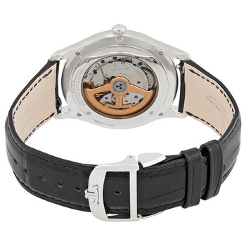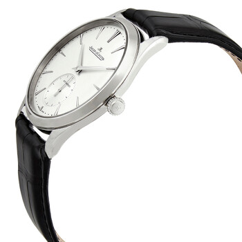 Stainless steel case with a black (alligator) leather strap. Fixed stainless steel bezel. Silver dial with silver-tone dauphine-style hands and index hour markers. Minute markers around the outer rim. Dial Type: Analog. Small seconds sub-dial at the 6 o'clock positions. . Jaeger LeCoultre calibre JLC 896/1 automatic movement, based upon Jaeger-LeCoultre 896, containing 32 Jewels, composed of 223 parts, bitting at 28800 vph, and has a power reserve of approximately 43 hours. Scratch resistant sapphire crystal. Transparent case back. Round case shape. Case size: 39 mm. Case thickness: 8 mm. Band width: 20 mm. Deployment clasp. Water resistant at 50 meters / 165 feet. Functions: hour, minute, small second. Master Ultra Thin Series. Luxury watch style. Watch label: Swiss Made. Jaeger LeCoultre MASTER ULTRA THIN Silver Dial Unisex Watch Q1218420.