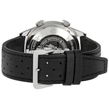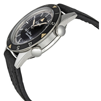 Silver-tone stainless steel case with a black calfskin leather strap. Fixed stainless steel bezel with a black top ring. Black dial with luminous arrow-shaped hands and index hour markers. Minute markers around the outer rim. Dial Type: Analog. Luminescent hands and markers. Jaeger LeCoultre Calibre JLC 956 Automatic movement, containing 23 Jewels, composed of 268 parts, bitting at 28800 vph, and has a power reserve of approximately 45 hours. Scratch resistant plexiglas crystal. Screw down crown. Solid case back. Round case shape, case size: 40.5 mm. Tang clasp. Water resistant at 100 meters / 330 feet. Functions: alarm, hour, minute, second, repeater. Additional Info: limited edition of 359 pieces. Memovex Tribute To Deep Sea Series. Luxury watch style. Watch label: Swiss Made. Item Variations: Q2028440, 2028440, 202.84.40, Q202.84.40. Jaeger LeCoultre Memovox Tribute to Deep Sea Black Dial Automatic Men's Watch Q2028440.