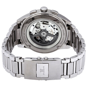 Stainless steel case with a stainless steel bracelet. Fixed stainless steel bezel. Black dial with luminous silver-tone hands and index hour markers. Arabic numerals mark the 6 and 12 o'clock positions. Minute markers. Tachymeter markings around the outer rim. Dial Type: Analog. Luminescent hands and markers. Chronograph - two sub-dials displaying: 30 minute and 12 hour. Jaeger LeCoultre calibre 751H automatic movement, based upon Jaeger LeCoultre calibre 751, containing 37 Jewels, bitting at 28800 vph, and has a power reserve of approximately 65 hours. Scratch resistant sapphire crystal. Pull / push crown. Transparent case back. Round case shape. Case size: 42 mm. Case thickness: 11.9 mm. Band width: 20 mm. Deployment clasp. Water resistant at 100 meters / 330 feet. Functions: chronograph, tachymeter, hour, minute, second. Polaris Series. Luxury watch style. Watch label: Swiss Made. Jaeger LeCoultre Polaris Automatic Chronograph Black Dial Men's Watch Q9028170.