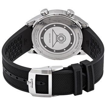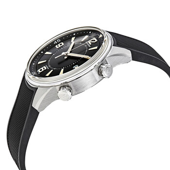 Stainless steel case with a black rubber strap. Fixed stainless steel bezel. Black dial with luminous silver-tone hands and index hour markers. Arabic numerals mark the 6, 9 and 12 o'clock positions. Minute markers around the outer rim. Dial Type: Analog. Luminescent hands and markers. Date display at the 3 o'clock position. Jaeger LeCoultre calibre 899A/1 automatic movement, based upon Jaeger LeCoultre 899, containing 32 Jewels, composed of 219 parts, bitting at 28800 vph, and has a power reserve of approximately 38 hours. Scratch resistant sapphire crystal. Solid case back. Round case shape. Case size: 42 mm. Case thickness: 13.1 mm. Band width: 20 mm. Deployment clasp. Water resistant at 200 meters / 660 feet. Functions: date, hour, minute, second. Polaris Date Series. Luxury watch style. Watch label: Swiss Made. Jaeger LeCoultre Polaris Date Automatic Black Dial Men's Rubber Watch Q9068670.