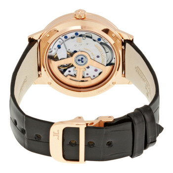 18kt rose gold case with a black alligator leather strap. Fixed 18kt rose gold bezel with diamond set. Silver dial with blue sword-shaped hands and Arabic numeral hour markers. Minute markers around an inner ring. Dial Type: Analog. One subdial displaying: day/night indicator. Jaeger LeCoultre Calibre JLC 898A/1 Automatic movement, containing 30 Jewels, bitting at 28800 vph, and has a power reserve of approximately 38 hours. Scratch resistant sapphire crystal. Transparent case back. Round case shape, case size: 34 mm, case thickness: 8.8 mm. Deployment clasp. Water resistant at 30 meters / 100 feet. Functions: hour, minute, second, day/night indicator. Rendez-vous Night And Day Series. Luxury watch style. Watch label: Swiss Made. Jaeger LeCoultre Rendez-Vous Night Day 18K Rose Gold Automatic Ladies Watch Q3442420.